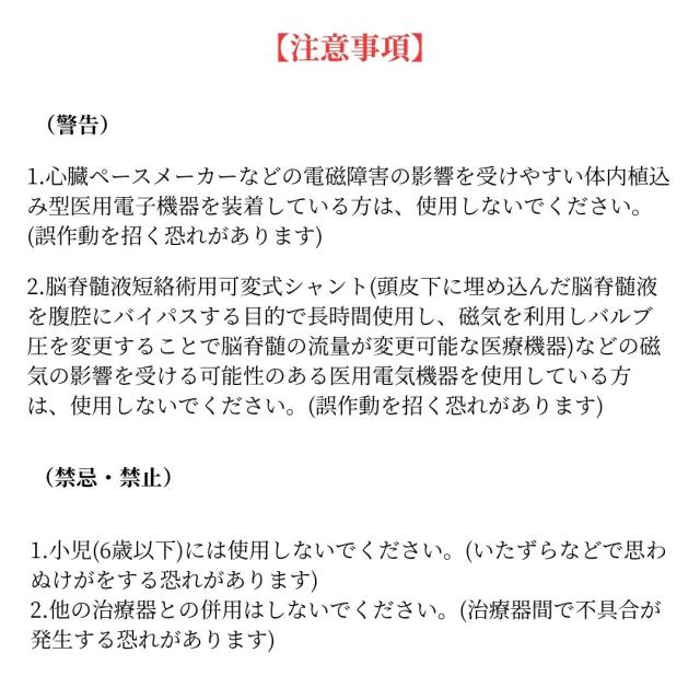 1.心臓ペースメーカーなどの電磁障害の影響を受けやすい体内植込み型医療用電子機器を装着している方は、使用しないでください。
