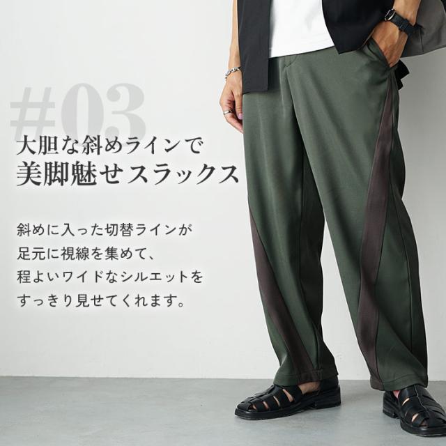 スポーティーな印象のななめラインの入ったスラックスと合わせることで、かっちりとし過ぎず程よいラフさを演出。