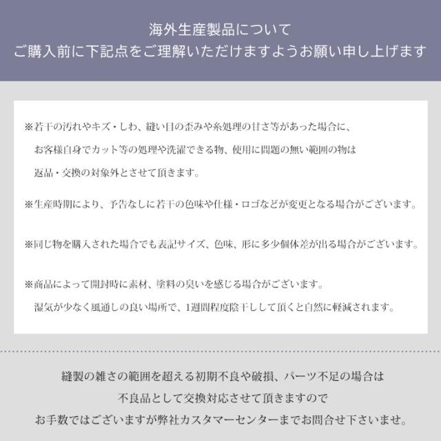 ■注意事項1:商品の開封時に素材の臭いを感じる場合がございます。湿気が少なく風通しの良い場所で、一週間程度陰干しして頂くと自然に軽減されます。
