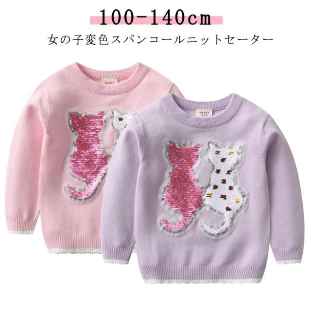 送料無料 ニット スパンコール 110cm クリスマス 長袖 ニットトップス キッズ 春 猫 こども服 子ども服 変色 子供服 無地 秋 120cm ピンク 100cm 女の子 スウェット 130cm 140cm 通園 通学 冬 プレゼント 送料無料 パープル 紫 猫 暖かい プレゼント