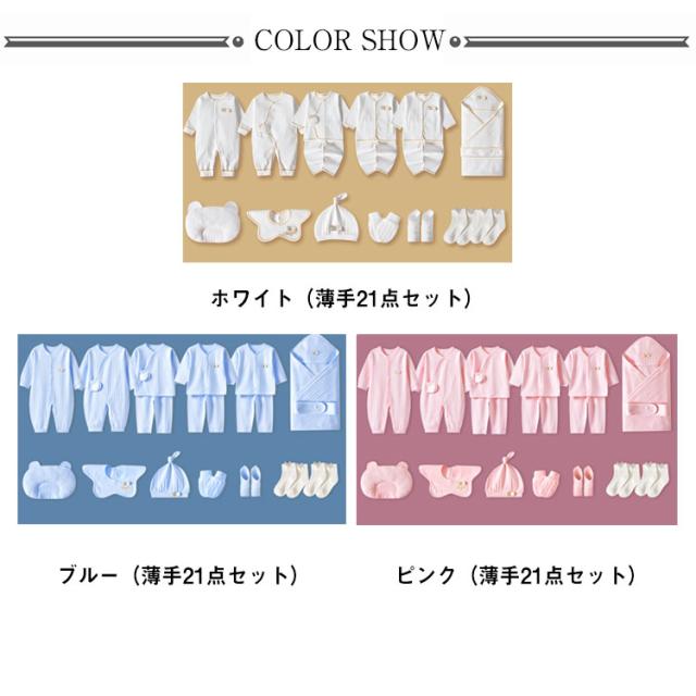 | 色 | ホワイト(薄手21点セット) ブルー(薄手21点セット) ピンク(薄手21点セット) |