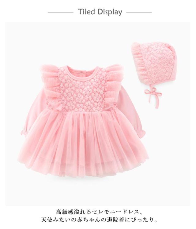 | お花刺繍とふんわりチュールフリルが高見えベビードレス。 高級感溢れるセレモニードレス、天使みたいの赤ちゃんの退院着にぴったり。 お肌に触れる部分は安心のコットン生地、赤ちゃんに嫌な刺激がなく、通気性・吸水性ともに優れ、蒸れにくくサラサラとした状態を保ちやすくなっています。 退院着やお七夜、お宮参り、家族顔合わせ、お食い初め、ハーフバースデー、お出かけ、結婚式、家族写真、月齢フォトなど 様々な場面に重宝します。 ドレスお揃いの帽子付きで、より可愛らしく顔周りが華やかに。 | |