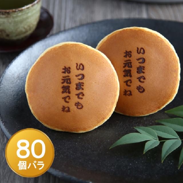 透明セロハンの特別な個包装 「いつまでもお元気でね」 メッセージ焼印入りどら焼き 暁 小倉あん 80個バラ 送料無料(北海道 沖縄除く) 老舗 和菓子 お菓子 和スイーツ 御祝 敬老の日 おかし おじいちゃん おばあちゃん 老人ホーム 景品 販促 イベント 配布 配る