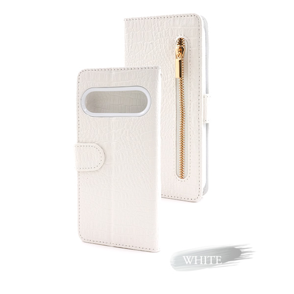 衝撃やキズなどからスマートフォンを守ります。 また、内部はソフトケースなので着脱が簡単です。 背面を折り返すとスタンドとして使用できるので、動画視聴に便利です。 横開きタイプなので、手帳のように使うことができます。 落下防止に最適なストラップホール付きです。 外側にファスナーポケットが付いているので、ちょっとした財布や小銭入れ代わりになって便利! また、内側に2つのカードポケットとサイドポケットが付いています。 高級感溢れるクロコダイルレザーデザイン。 ビジネスやカジュアルなど様々なシーンで活躍します。 | ||||||||||||||