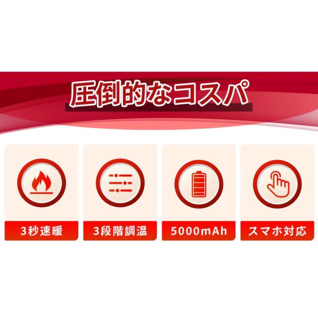 【5000mA長連続使用時間、3段階温度調節】5000mAh、DC3.7Vバッテリを搭載、大容量でより長く使えます。低温モード(青)40~45℃、(約)6.5時間使用可能。中温モード(白)45~55℃、約5.5時間使用可能。高温モード(赤)55~60℃、約3.5時間使用可能。【タッチパネル対応、滑り止め抜群】電熱手袋の人差し指、親指部分にタッチパネル対応の素材を使用し、手袋のままでスマホを操作可能。手のひら部分に滑りにくいPU素材を使用し、抜群のグリップ力を発揮。