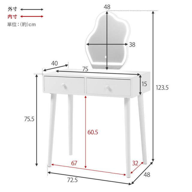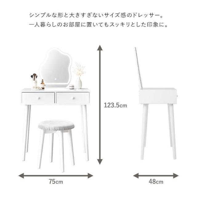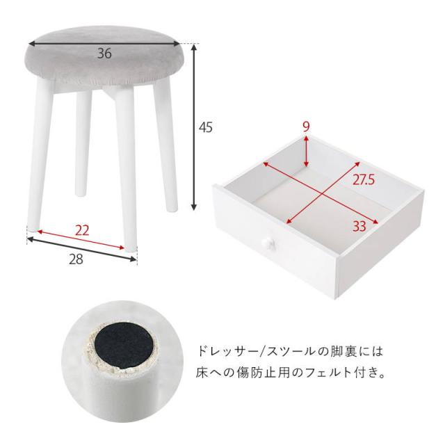 サイズ:ドレッサー:(約)幅75×奥行48×高さ123.5cm、スツール:(約)幅36×奥行36×高さ45cm