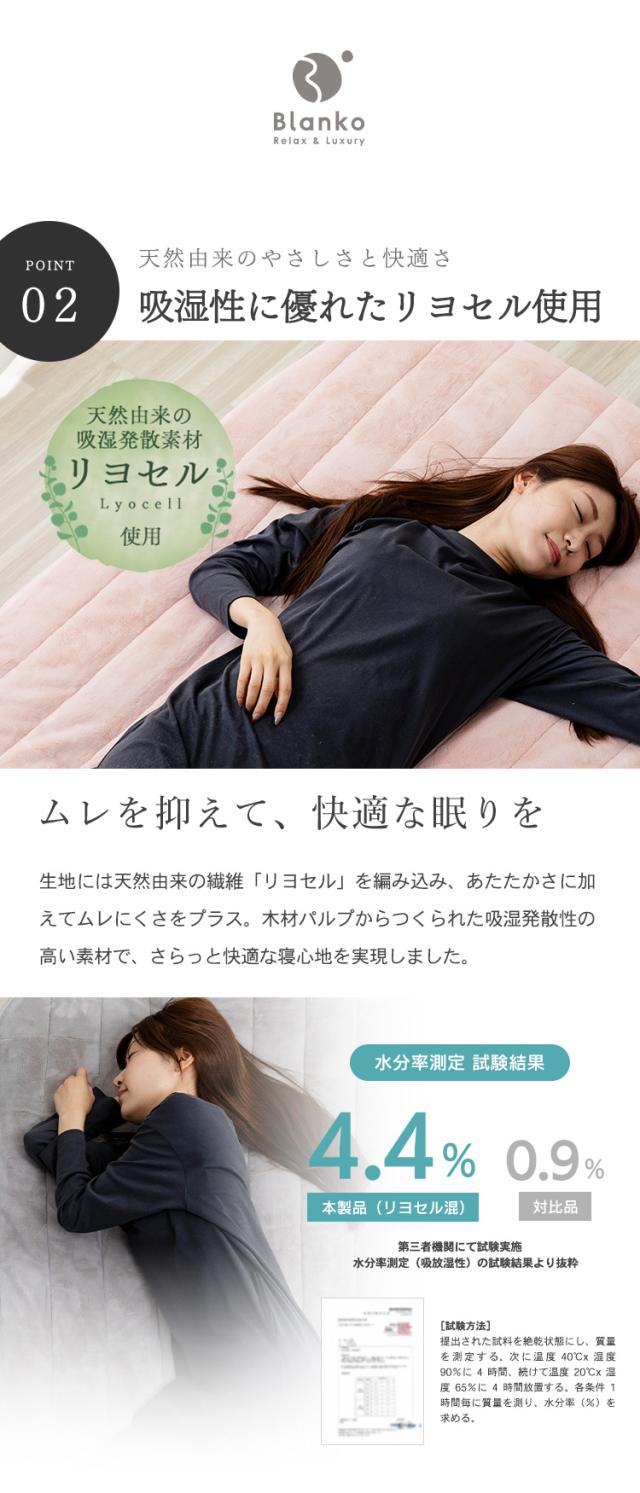 人は就寝中に汗をかく為、寝具に吸湿性や、放湿性があるとより快適に眠れると言われます。表面生地に、吸放湿性のある天然由来の(木材パルプを原料としている)レーヨンを編み込み、あたたかさに、ムレにくさを加えました。