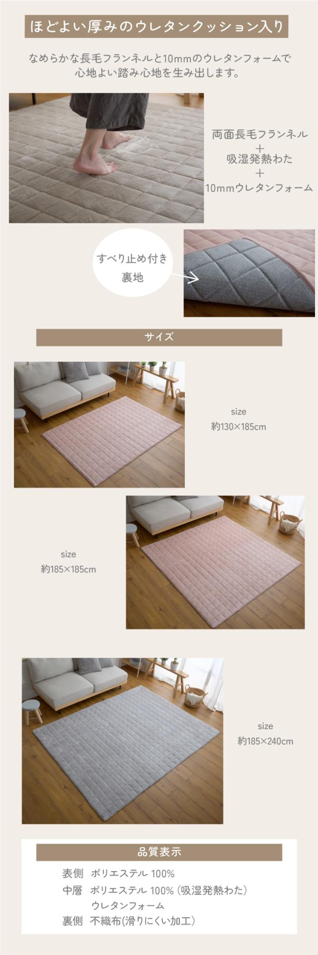 表:毛羽部分:ポリエステル100%(フランネル長毛マイクロ330g/m2) グランド部分:ポリエステル100% 中綿:ポリエステル100%吸湿発熱綿 洗えるウレタン20D 10mm 裏:不織布滑り止め付き