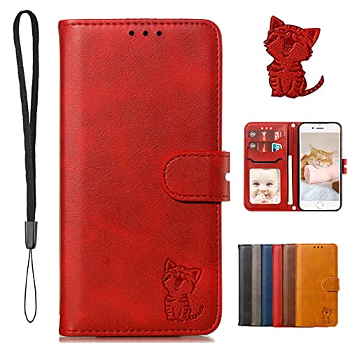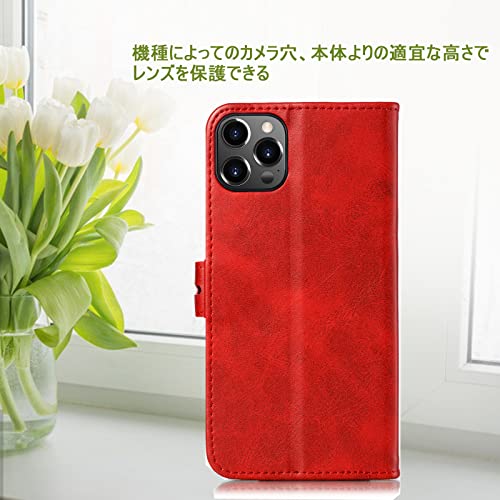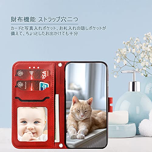 iPhone 13 pro max ケース 手帳型 ストラップホール 猫柄 動物 アニマル スマホカバー ストラップ付き カード収納 ベルトマグネット スタンド機能 薄型 男女兼用 (iPhone13 Pro Max 6.7inch対応) レッド