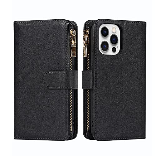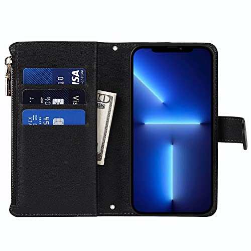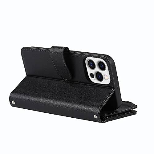 iPhone 13 Pro ケース 手帳型 肩掛け 首かけ 斜めがけ ショルダー TPU PUレザー マグネット iPhone13 Pro 財布型 お札 小銭 大容量 収納 スタンド アイフォン13プロ ストラップ付き 落下防止 耐衝撃 耐摩擦 全面保護 (肩縄付き-ブラック)