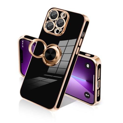 iPhone 13 ProMax ケース リング付き カバー メッキ加工 耐衝撃 車載ホルダー 360°回転 スタンド機能 ストラップホール付き スマホケース TPU 滑り止め 衝撃吸収 携帯ケース カメラ保護 ソフト 13ProMax ケース 6.7インチ用 (ブラック)