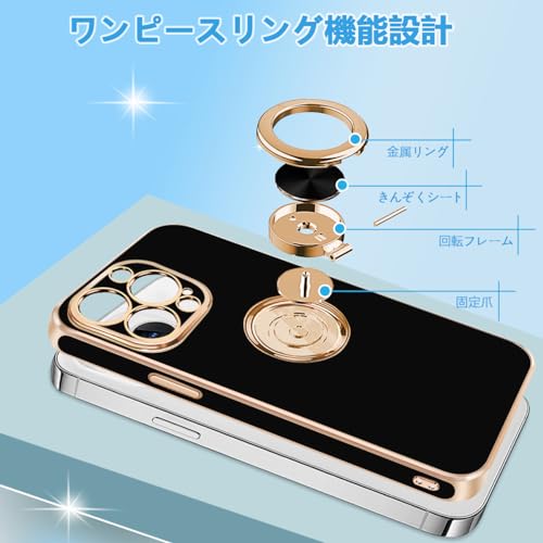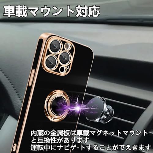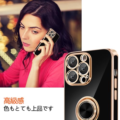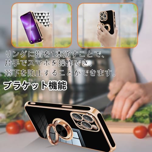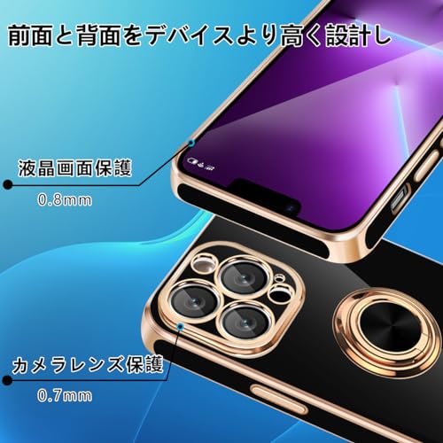 iPhone 13 ProMax ケース リング付き カバー メッキ加工 耐衝撃 車載ホルダー 360°回転 スタンド機能 ストラップホール付き スマホケース TPU 滑り止め 衝撃吸収 携帯ケース カメラ保護 ソフト 13ProMax ケース 6.7インチ用 (ブラック) 送料無料