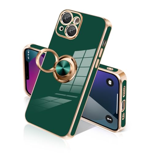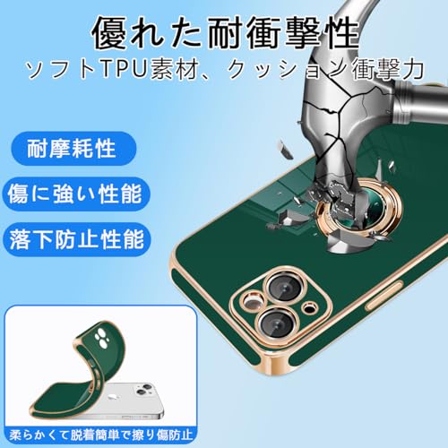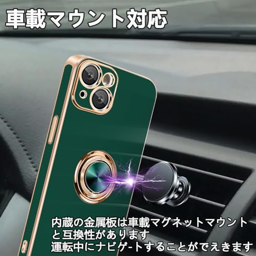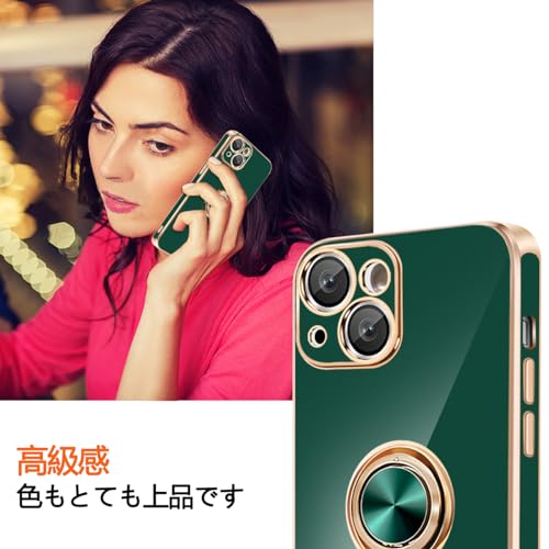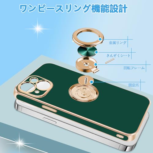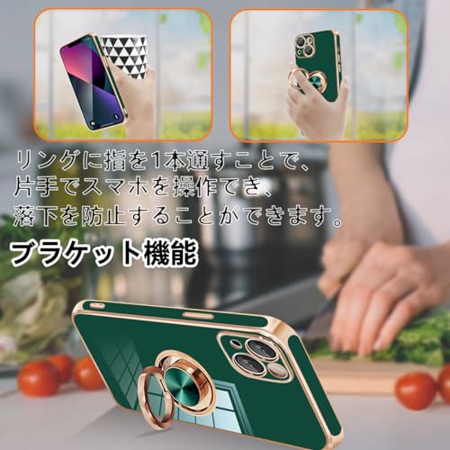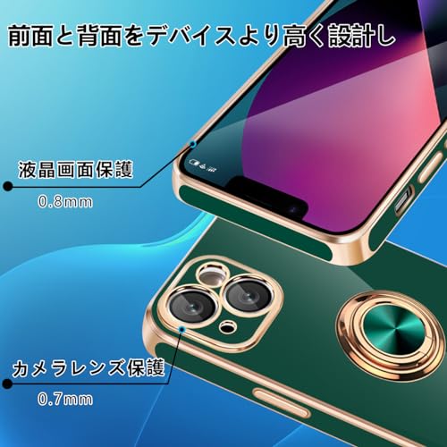 iPhone 13 ケース リング付き カバー メッキ加工 耐衝撃 車載ホルダー 360°回転 スタンド機能 ストラップホール付き スマホケース TPU 滑り止め 衝撃吸収 携帯ケース カメラ保護 ソフト 13 ケース6.1インチ用 (グリーン)