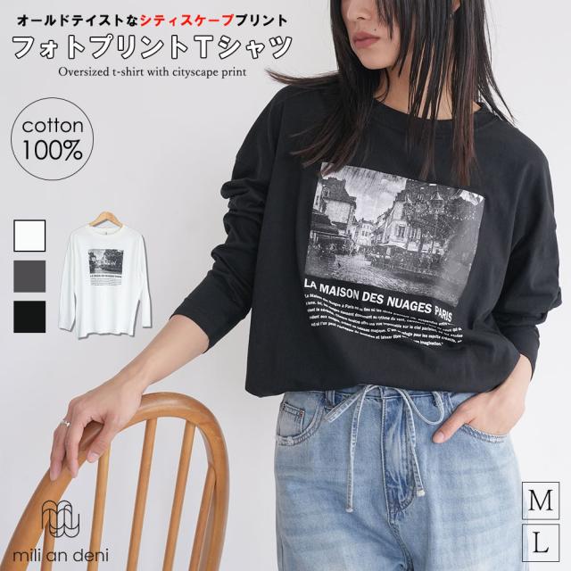 春新作 フォトプリントロンT 風景 フォト クルーネック コットン 綿100% 長袖 M L トップス レディース 春夏 ミリアンデニ メール便(郵2) t92255