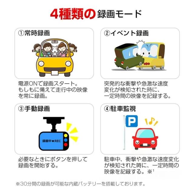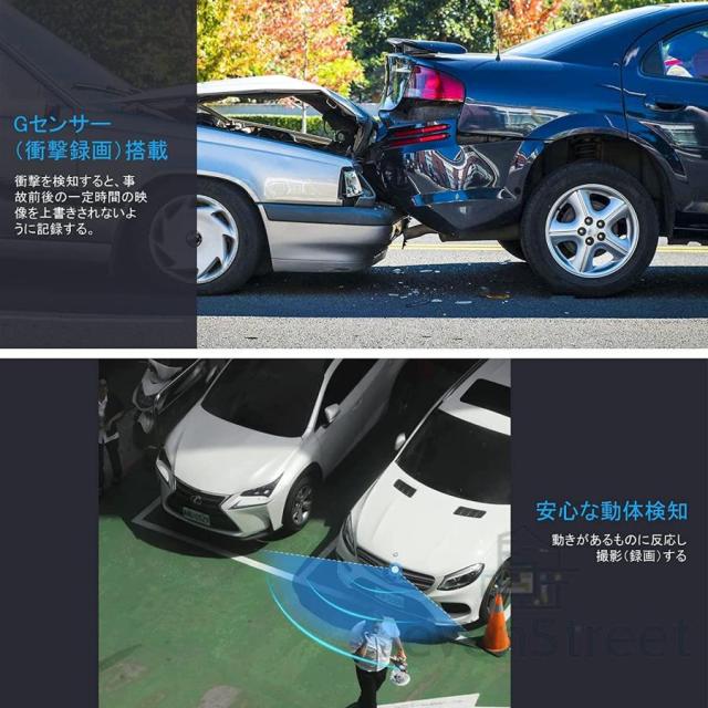 【多機能ドライブレコーダー】:ドライブレコーダーはGセンサー、衝撃録画、常時録画、ループ録画、駐車監視、動体検知、音声録音などに対応しています。