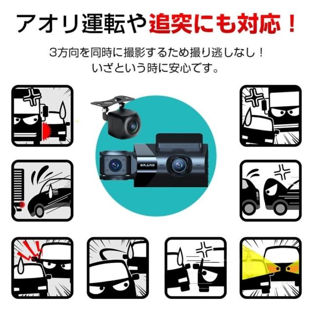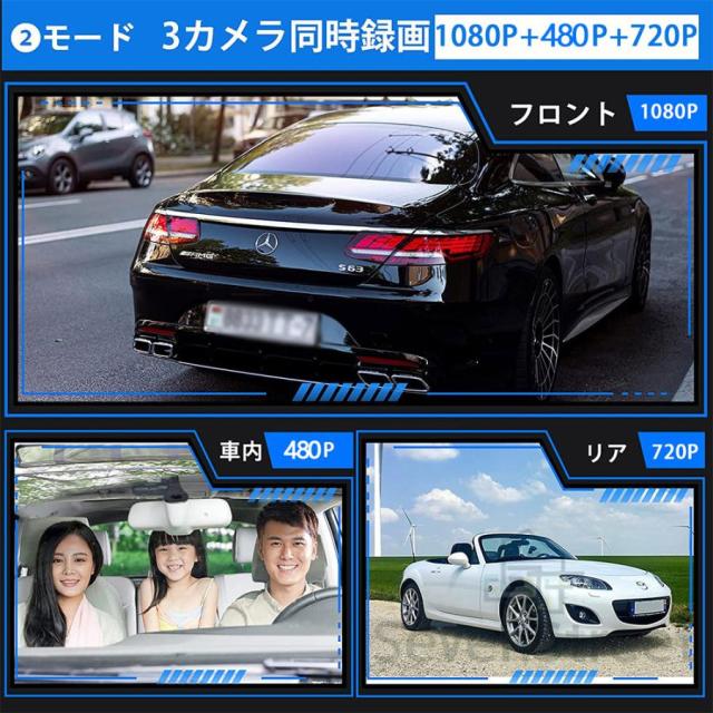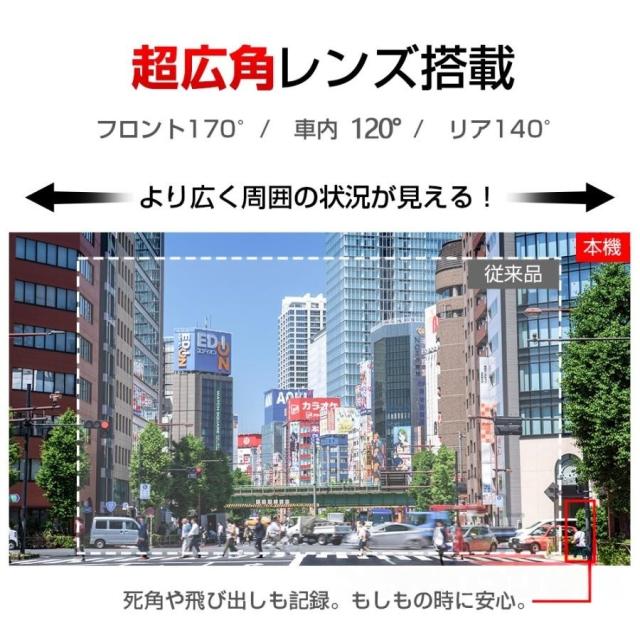 【前後3カメラ同時録画】:フロントカメラ:170°広角、車内カメラ:120°、広角リアカメラ:140°広角により、多車線幅の道路でも死角せず前方の状態がもちろん確認できて、後方から追突された場合もしっかり記録できます。