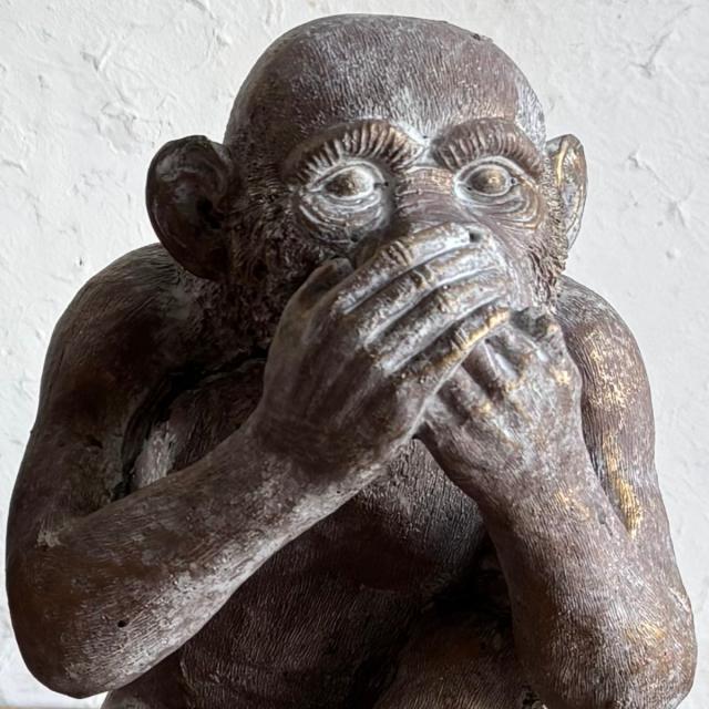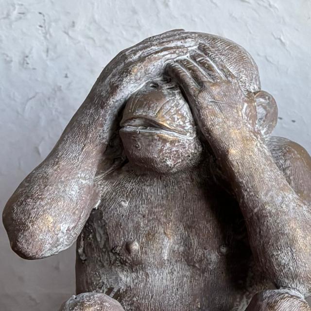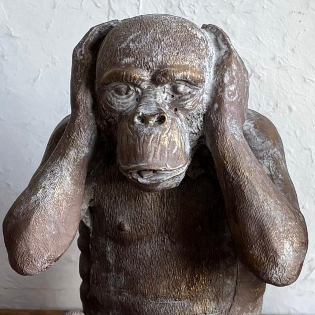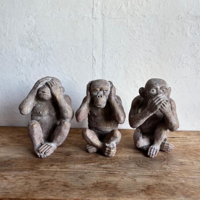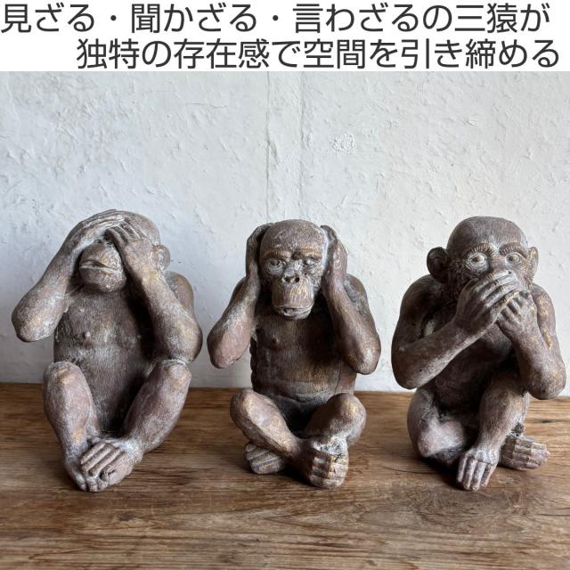 「見ざる・聞かざる・言わざる」を表現した表情豊かなサルのガーデンオーナメントです。素朴な石像風の質感とアンティーク調の仕上げが、お庭やお部屋に落ち着いた雰囲気をプラス。並べて飾るのはもちろん、単体でアクセントとして置いても存在感があります。