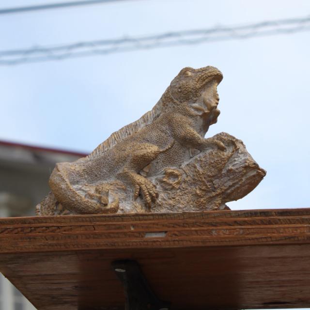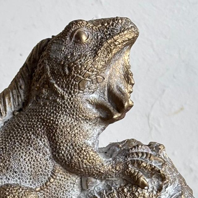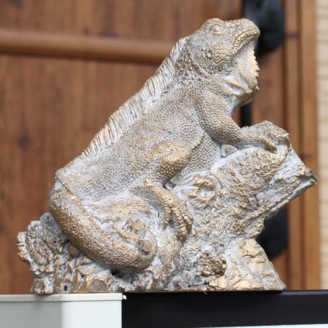 躍動感あふれる姿で岩に登るトカゲを表現したオブジェ