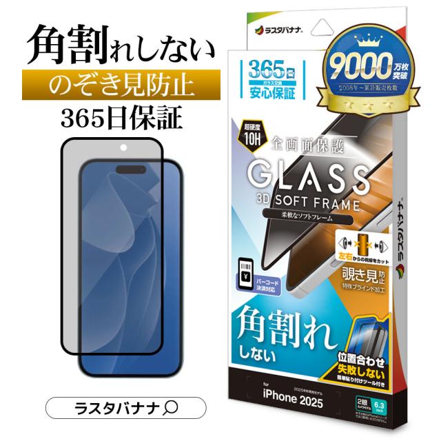 iPhone17 iPhone17 Pro ガラスフィルム 全面保護 のぞき見防止 覗き見防止 左右 角割れしない ソフトフレーム 0.33mm 硬度10H ガイド枠付き アイフォン 保護フィルム ラスタバナナ