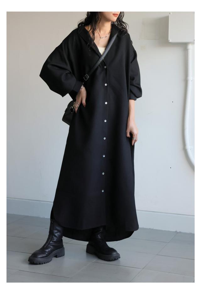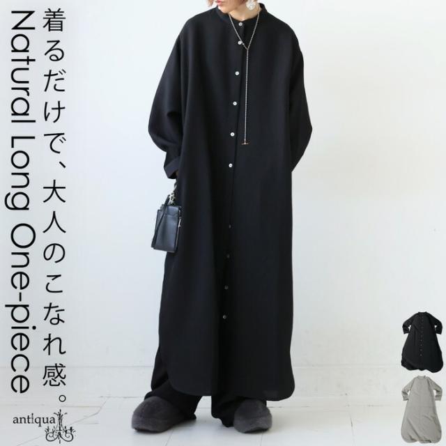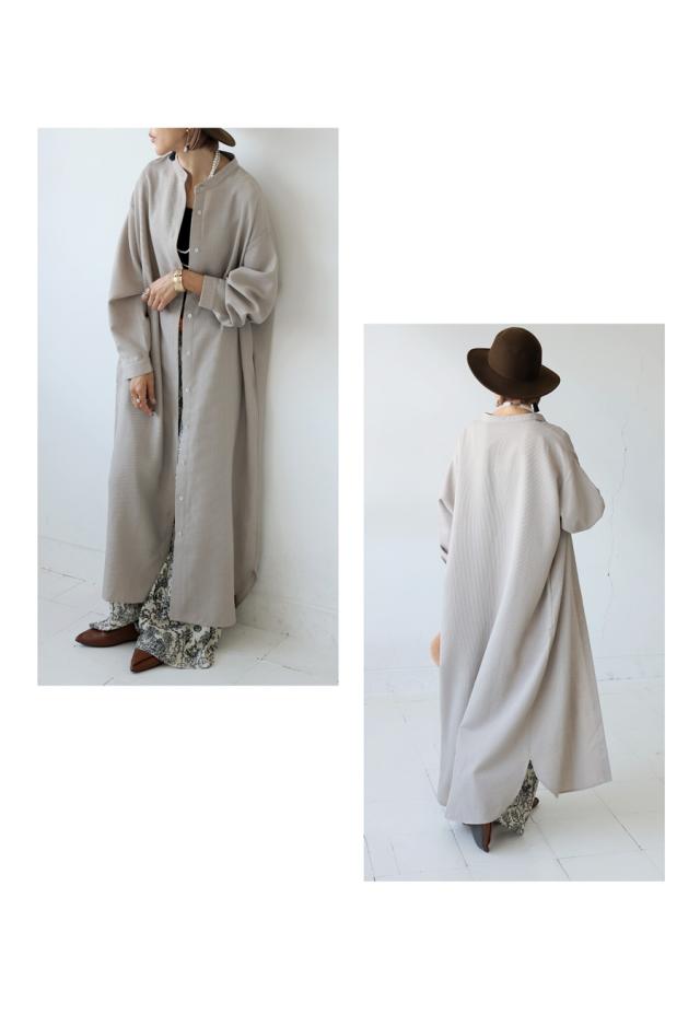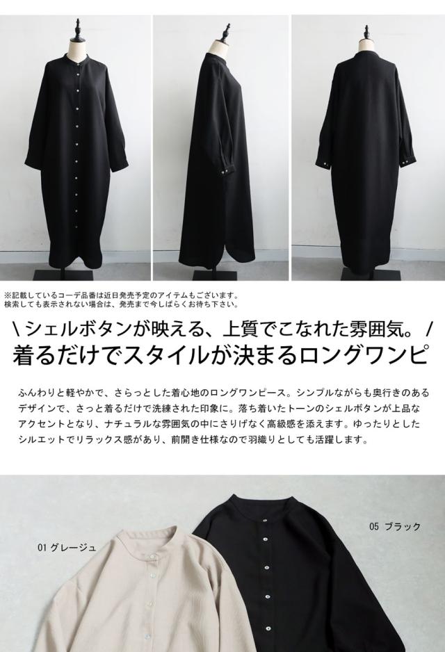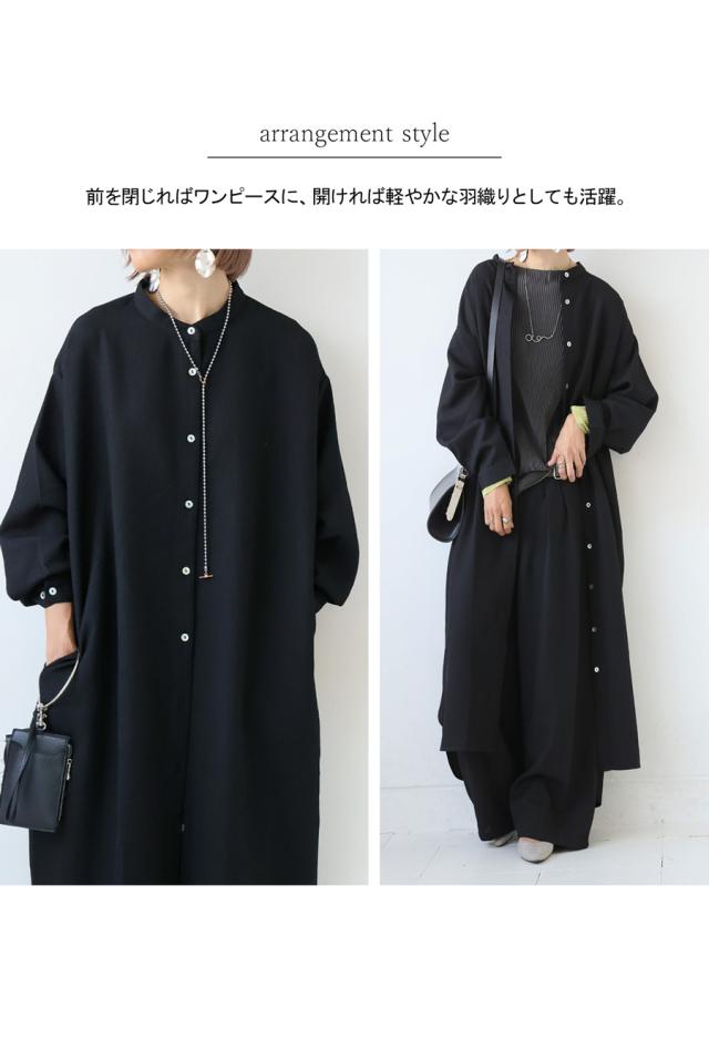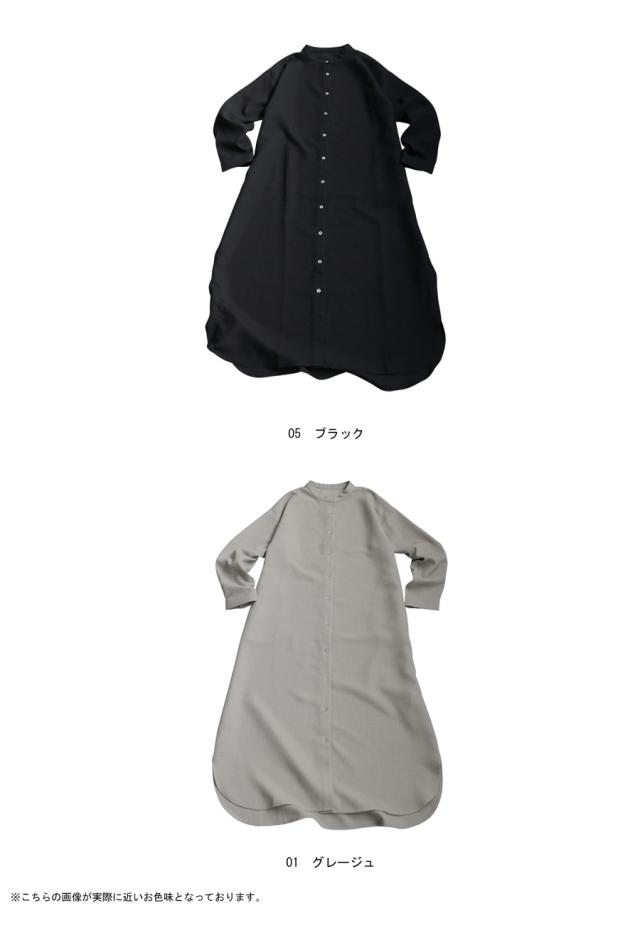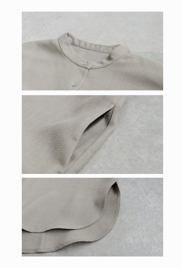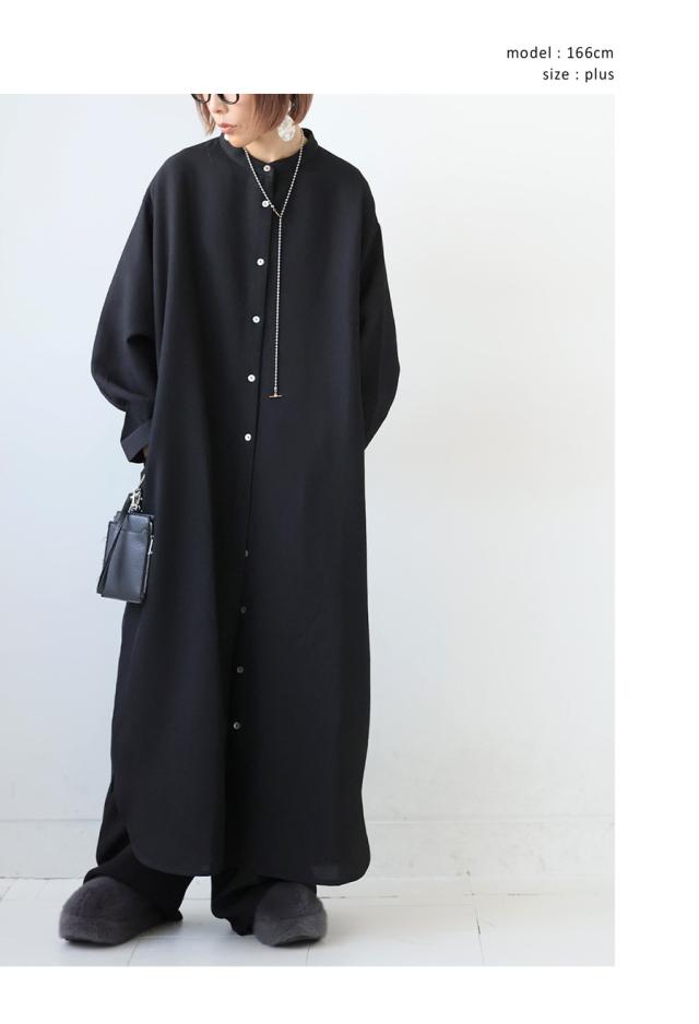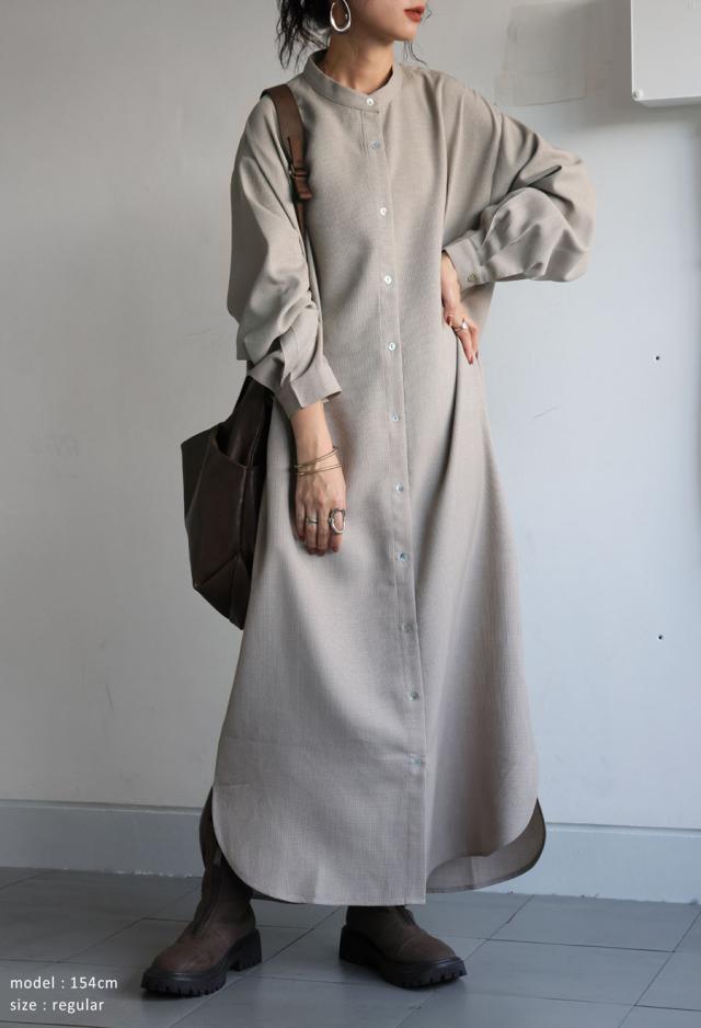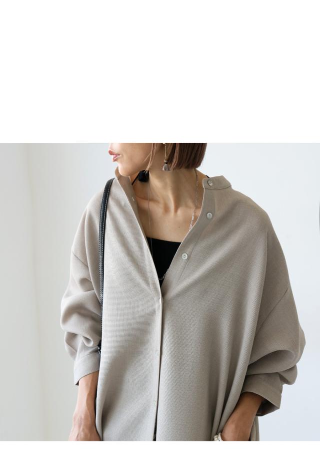 ネックラインはスタンドカラー(バンドカラー)で、顔まわりをすっきりと見せてくれます。