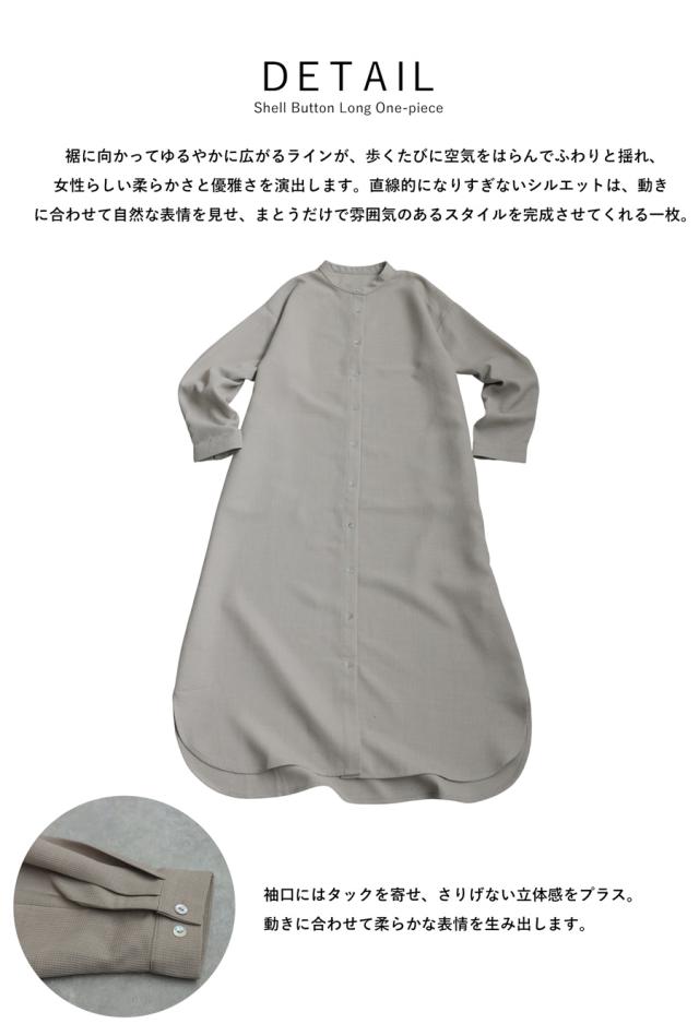 柄は無地でスタイリングを選ばず、シェルボタンが上品なアクセントに。