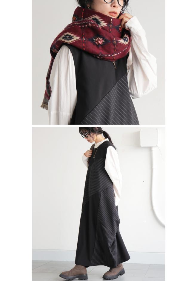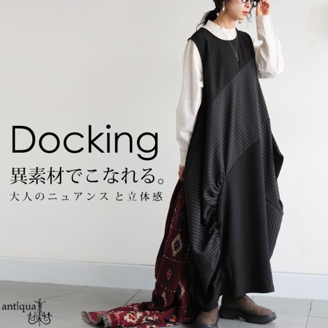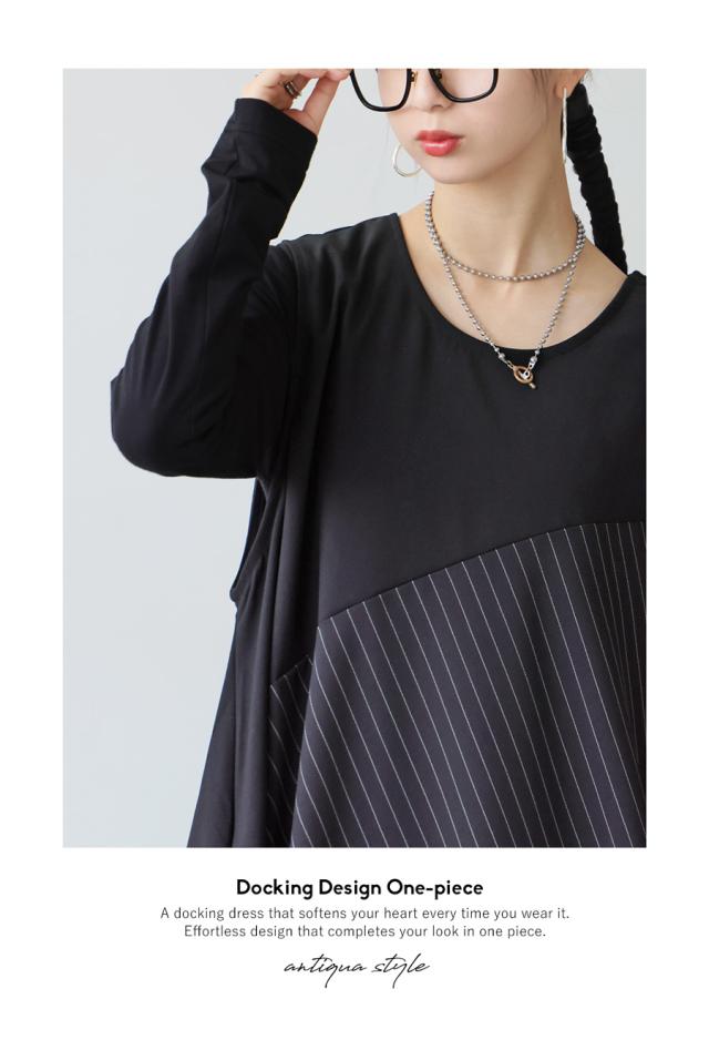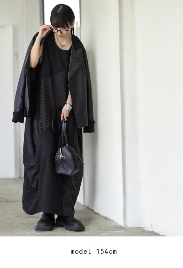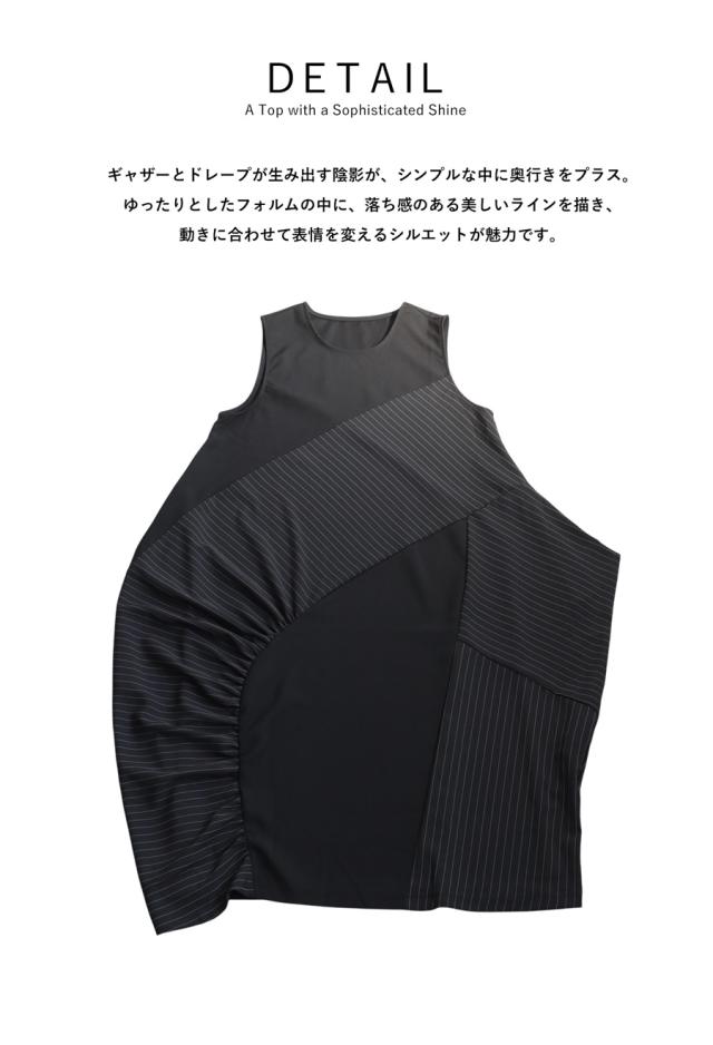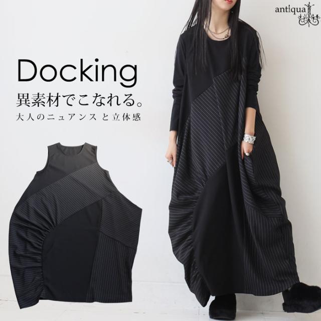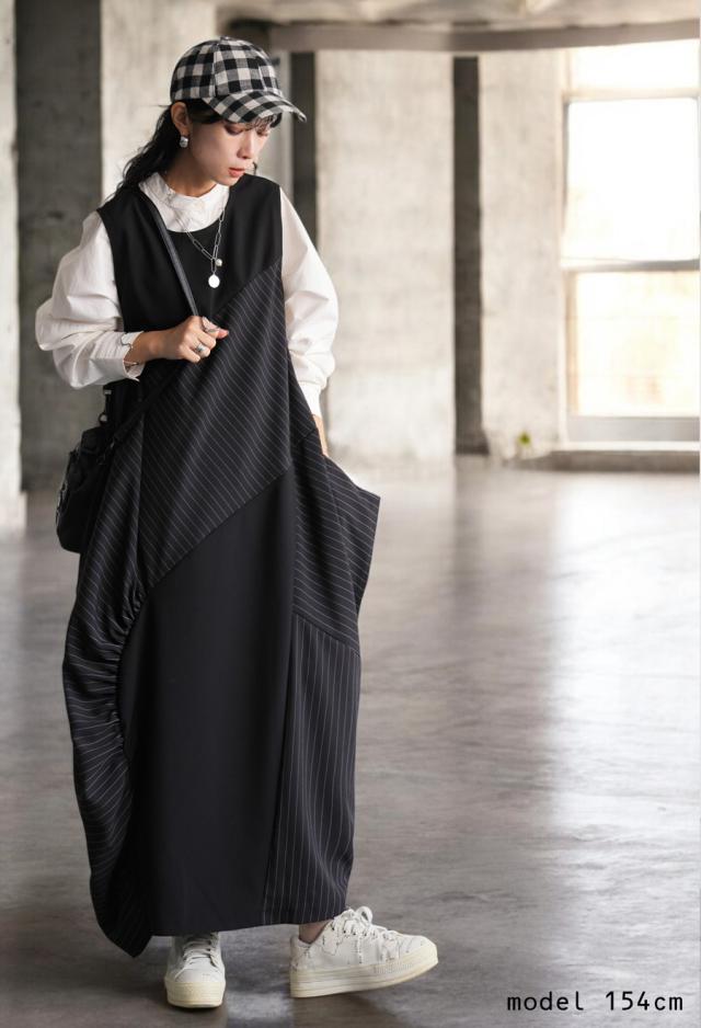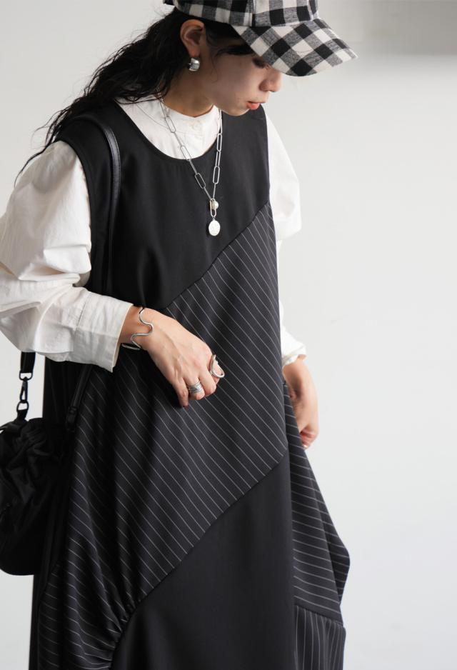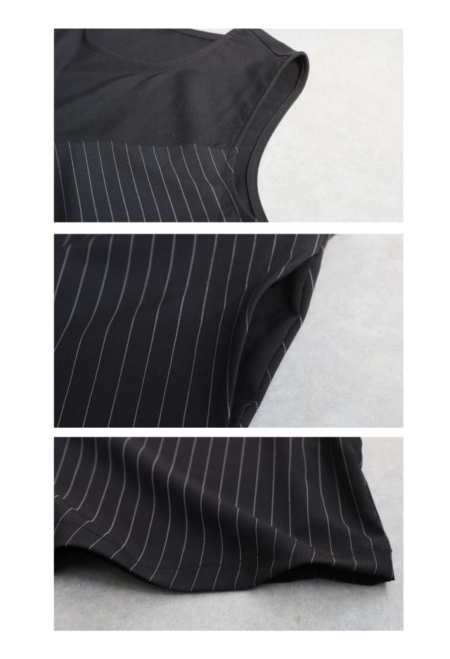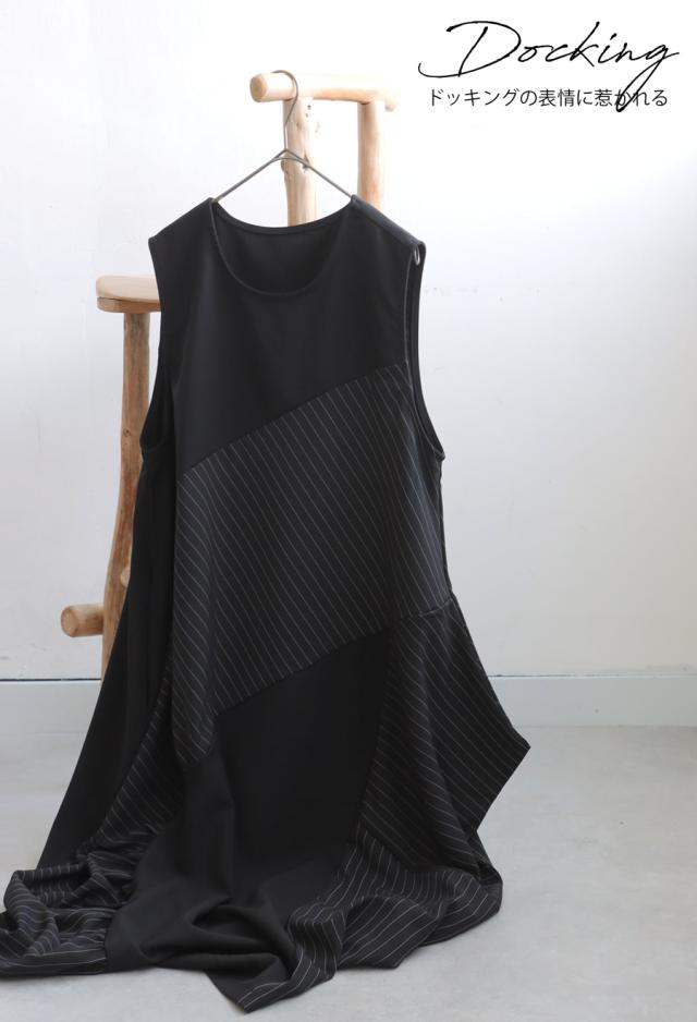 pa-03841 異素材 デザイン Aライン ノースリーブ 無地 ストライプ 柄 切替え ドレープ 着やせ 体型カバー 着回し ナチュラル モード おしゃれ シンプル カジュアル ドッキング
