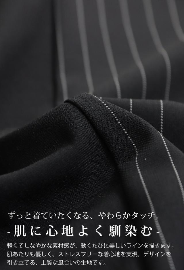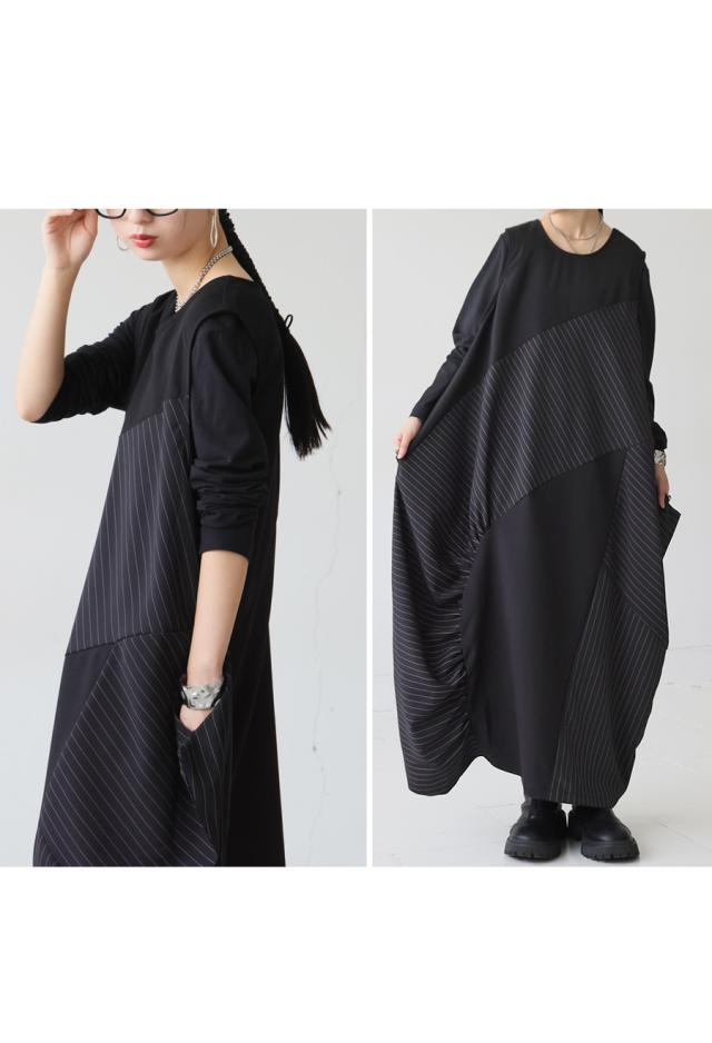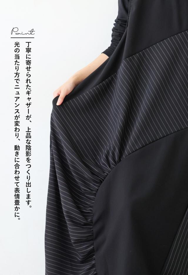 片側に寄せたギャザーがアクセントとなり、柄の異なるピンストライプと無地の切替で動きのある表情を演出。