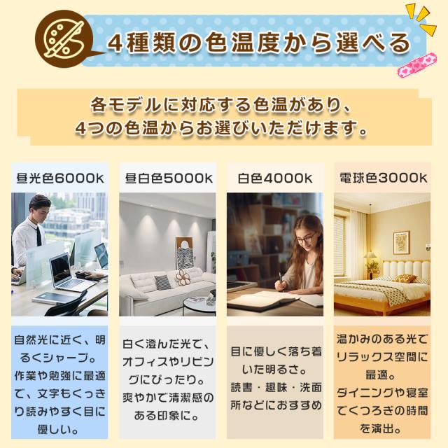発光色:電球色3000K/白色4000K/昼白色5000K/昼光色6000K
