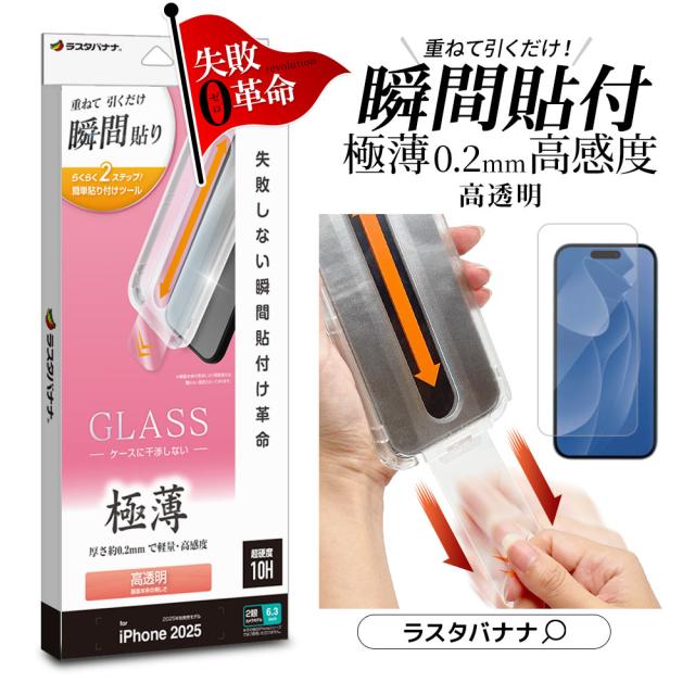 iPhone17 iPhone17 Pro ガラスフィルム 平面保護 高光沢 高透明 クリア 薄型 極薄 0.2mm 硬度10H 貼付革命 瞬間貼り 失敗しない瞬間簡単貼り付け レボリューション アイフォン 保護フィルム ラスタバナナ