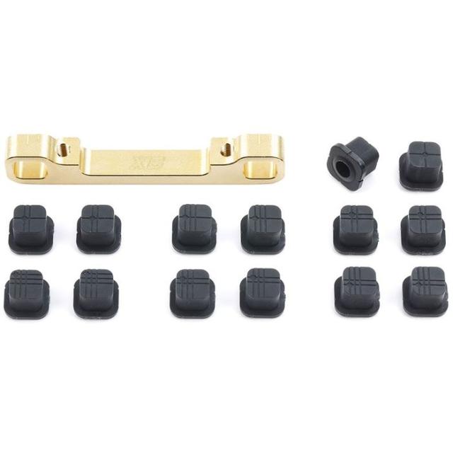 アルミに比べて重いブラス(真ちゅう)製のため、ウエイトとしても機能するサスマウント。付属の樹脂製ブッシュにより、トー角、車幅、ロールセンター、スキッド角の変更も手軽です。