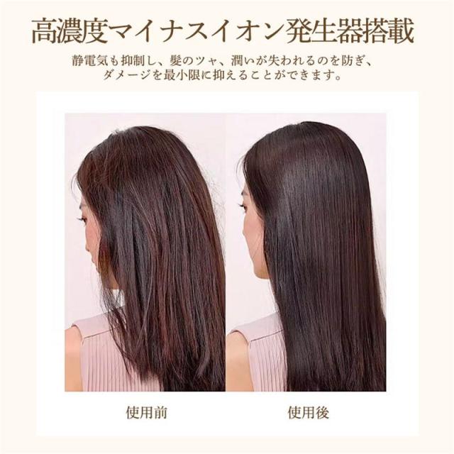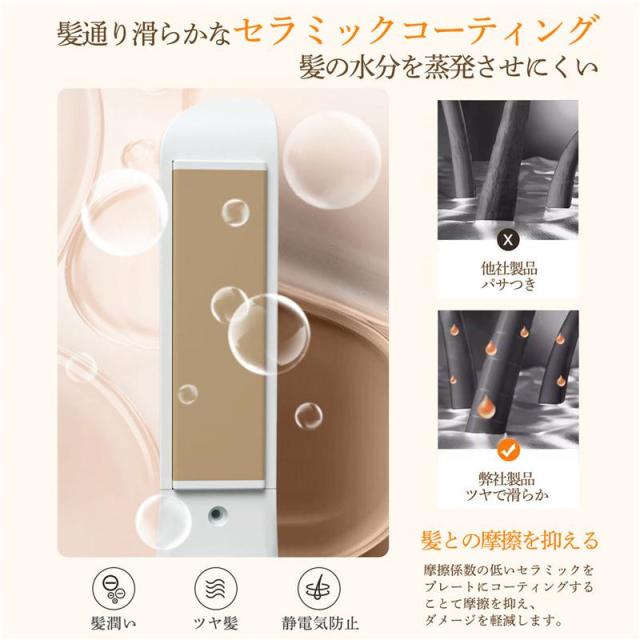 ヘアアイロンに搭載されたマイナスイオン機能は、髪の静電気を効果的に防ぎ、パサつきや広がりを抑制します。