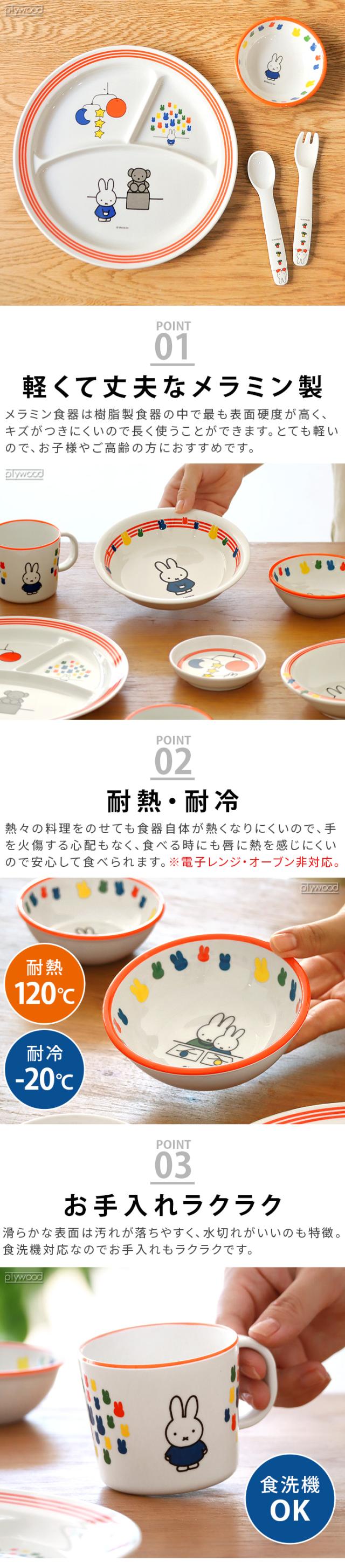 丈夫で割れにくく、誰でも安心して使うことができるメラミン製のMiffy食器シリーズのご紹介です。メラミン食器はキズがつきにくく、長く使うことができます。また、滑らかな表面は汚れが落ちやすく、水切れがいいのも特徴。食洗機対応なのでお手入れもラクラクです。熱々の料理をのせてもお皿自体が熱くなりにくいので、火傷の心配が少ないので、小さなお子さまやご高齢の方も安心してご使用できます。