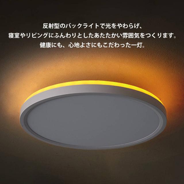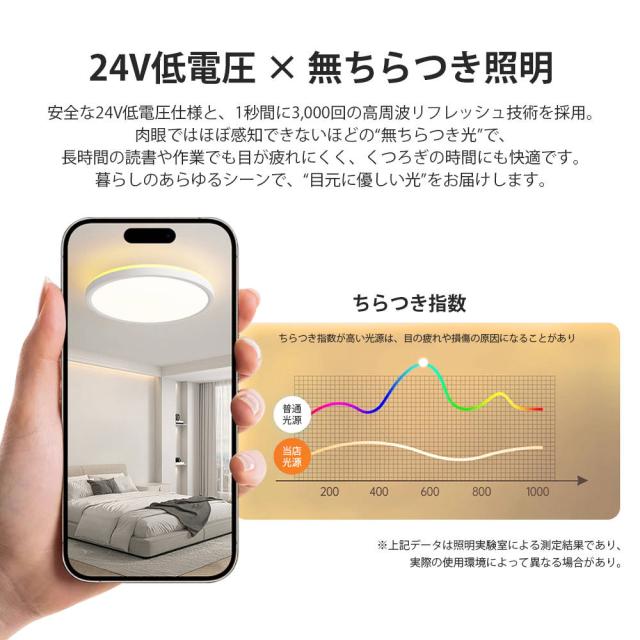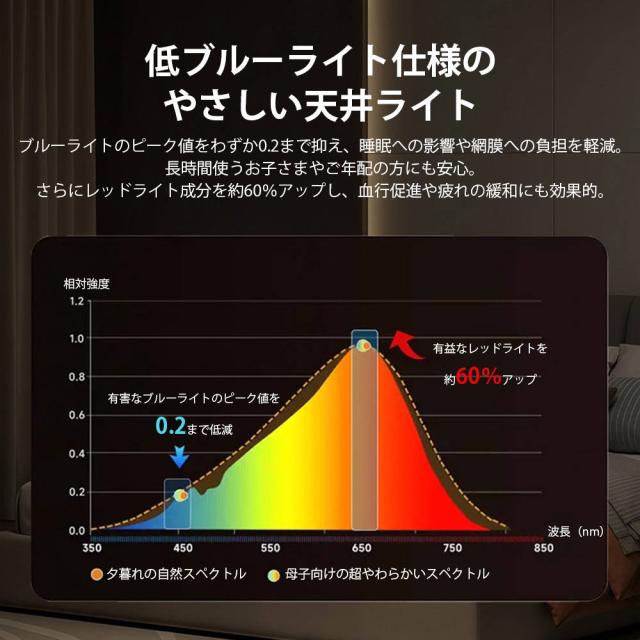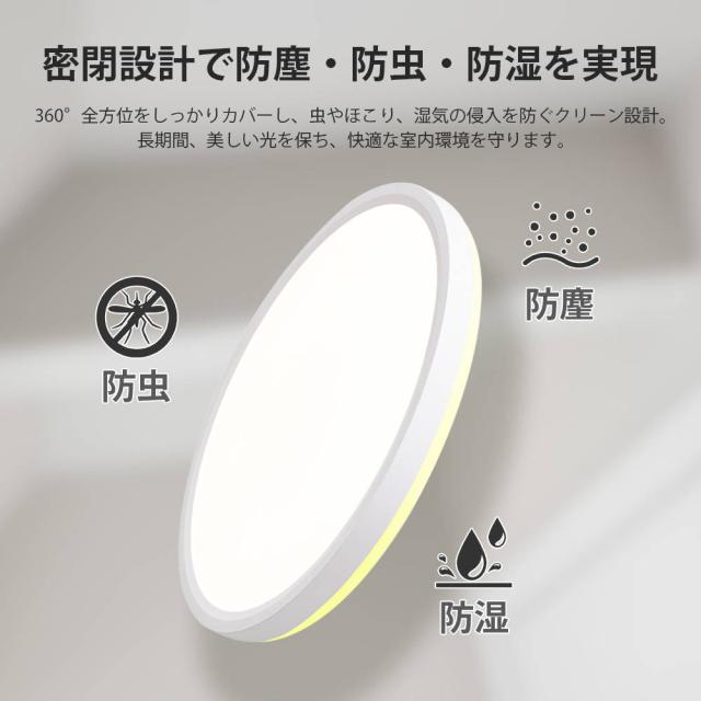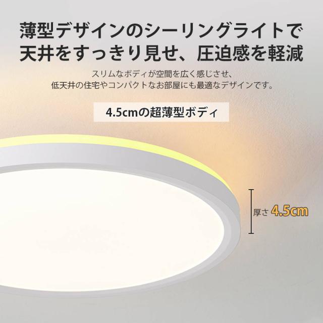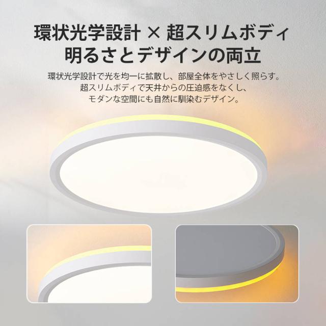 高効率LEDレンズを採用し、低消費電力ながら蛍光灯の約2倍の明るさを実現。電気代は蛍光灯の約半分です。5畳〜8畳の部屋を全方向に明るく照らします。極薄設計とホワイトフレームで、スタイリッシュかつ広々とした空間を演出します。