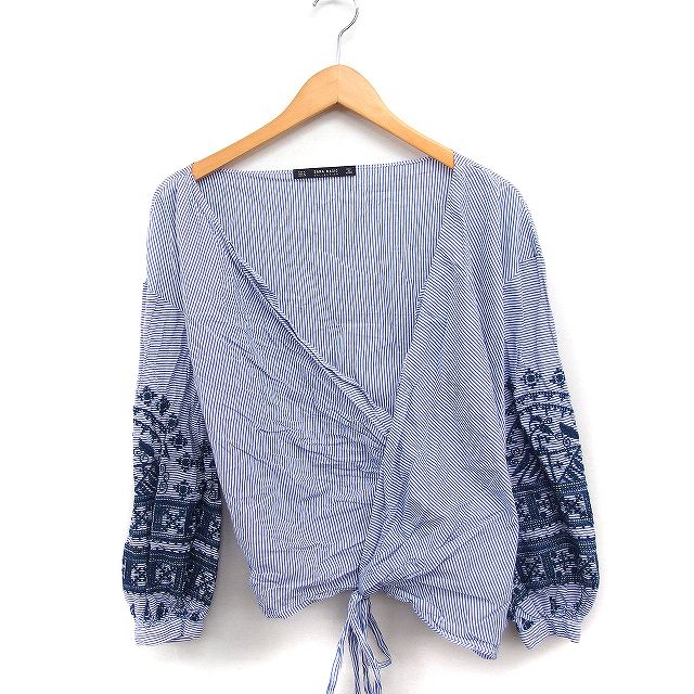 【中古】ザラ ベーシック ZARA BASIC ストライプ カシュクール シャツ ブラウス 長袖 刺繍 コットン 綿 M ブルー 青