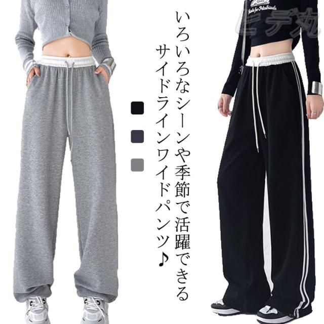 サイドライン ワイドパンツ スウェットパンツ ラインパンツ レディース ジャージ ゆったり ワイドパンツ スウェット ボトムス ウエストゴム イージーパンツ 裾 ゴム入り 絞れる ドローコード 部屋着 長ズボン