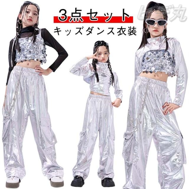 3点セット シルバー キッズ ダンス衣装 セットアップ へそ出し キャミソール ヒップホップ 女の子 子供服 長袖 トップス パンツ カッコイイ Hiphop チアダンス ダンスウエア ステージ衣装 ジャズダンス 韓国k-pop jazz 練習着 舞台服 発表会 団体服