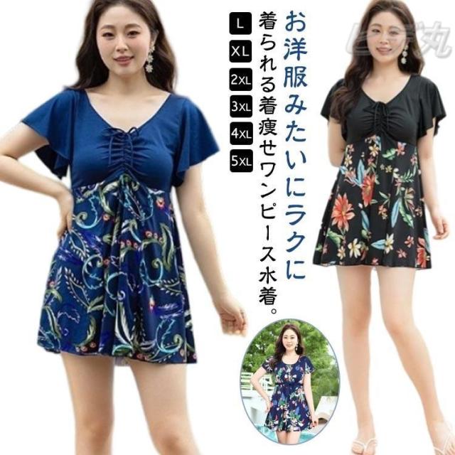 露出控えめ オールインワン 体型カバー水着 花柄 カバーアップ オフショルダー ぽっちゃり フレア 大きいサイズ レディース 二の腕 ワンピース水着