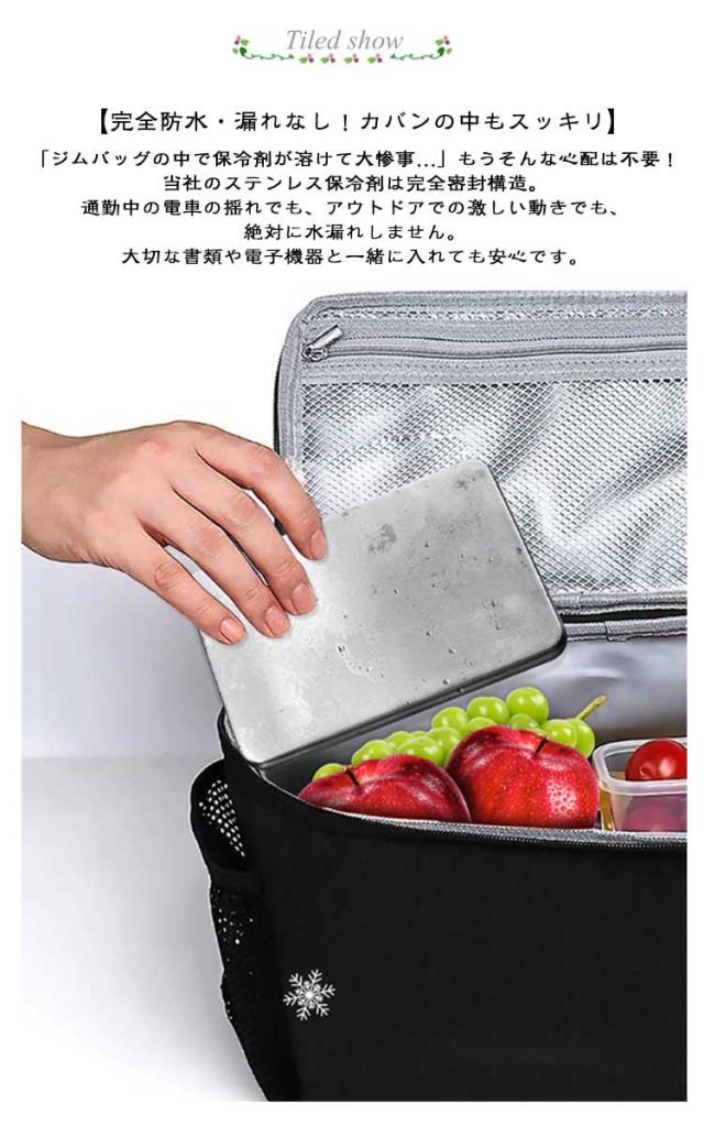 | “次世代の超コンパクト保冷剤”|驚異の12倍の冷却力! 超急速冷凍 繰り返し 長時間保冷 おすすめポイント ・長時間持続保冷性能 ・持ち運び便利 ・SUS304を使用 ・圧倒的コンパクト設計 ・繰り返し使える経済的&衛生的 ・様々なシーンで活躍 【完全防水・漏れなし!カバンの中もスッキリ】 「ジムバッグの中で保冷剤が溶けて大惨事...」もうそんな心配は不要!当社のステンレス保冷剤は完全密封構造。通勤中の電車の揺れでも、アウトドアでの激しい動きでも、絶対に水漏れしません。大切な書類や電子機器と一緒に入れても安心です。 【朝セットした冷たさが夕方まで持続!】 炎天下の車内駐車でも、厚さ13mmの高密度ステンレスが熱を遮断。ランチタイムのドリンクはもちろん、帰宅後の一杯のビールも最適な温度でキープ。アスリートのクールダウンや、野外イベントの暑さ対策にも最適です。 【間接冷却で鮮度キープ!】 食品に直接触れずに冷却できるから衛生的。クーラーボックス内の温度ムラを解消し、飲み物や食材を均一に冷却。ピクニックでもBBQでも、素材の美味しさを最後まで楽しめます。 【スリム設計で収納ラクラク!】 コンパクトなのにパワフル冷却。ビジネスバッグの隙間にも、グローブボックスの中にもすっきり収納。出張や通勤時に邪魔になりません。 【マルチユースでどんなシーンでも活躍!】 ・オフィスのデスクでドリンクをひんやりキープ ・ゴルフバッグに入れてタオルを冷やしておける ・車内で薬品などの温度管理に ・アウトドアギアの熱中症対策に 1つ持っていれば、あらゆる場面で「持ってて良かった!」と思える便利アイテムです。 使用方法: 1 アイストレイをよく洗う 2 冷凍庫で4時間冷やす 3 袋やランチボックスに入れる 4 飲み物を冷たいまま保てます (保冷効果が持続します) | |