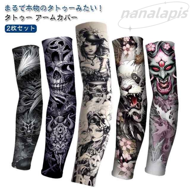 送料無料 タトゥー アームカバー アームスリーブ 2枚入り 接触冷感 男女兼用 レディース メンズ 女性 男性 肘サポーター uvカット 紫外線対策 日焼け予防 腕カバー 仮装 コスプレ おしゃれ かっこいい デザイン豊富 刺青 入れ墨 ロング 大仏 鯉 鶴柄 骸骨 スカル
