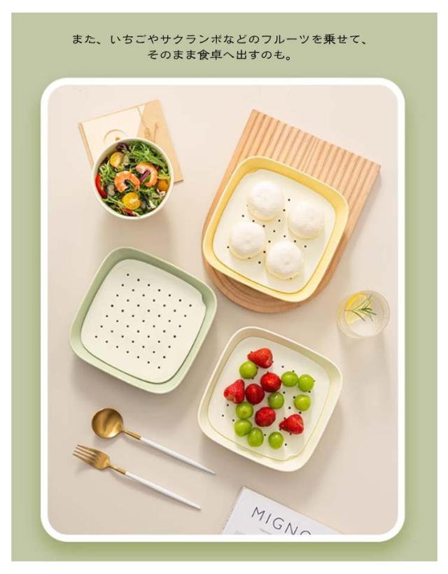 | 蒸し料理を手軽に作れる陶器の蒸し皿。 せいろがなくても、使いたい時はフライパンにセットするだけで、美味しくてヘルシーな蒸し料理が手軽にに楽しめる陶器蒸し器セット。 陶器の蒸し皿をセットし、火にかけるだけで蒸し料理が完成。旨味や栄養素をしっかり閉じ込め、油分を落としてくれるのでヘルシーに仕上がります。 高温に耐えられる陶器製なので、食器洗浄機、乾燥機、電子レンジ、オーブン、エアフライヤーに対応できるから、健康無毒で、お手入れも簡単。 蒸してそのまま食卓に出せるお洒落なデザイン、時間短縮に。 穴が空いている形状なので、水切り皿として使うのも便利。パスタ皿、揚げ物や天ぷらなどの盛り皿、モーニングやランチのワンプレートの盛り付けにも大活躍してくれます。 また、いちごやサクランボなどのフルーツを乗せて、そのまま食卓へ出すのも◎。 | |