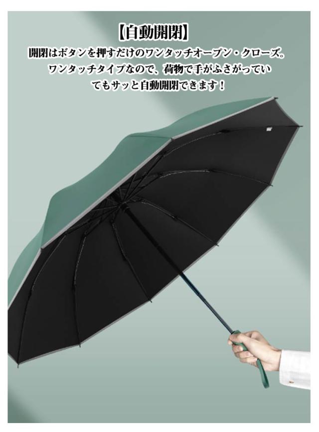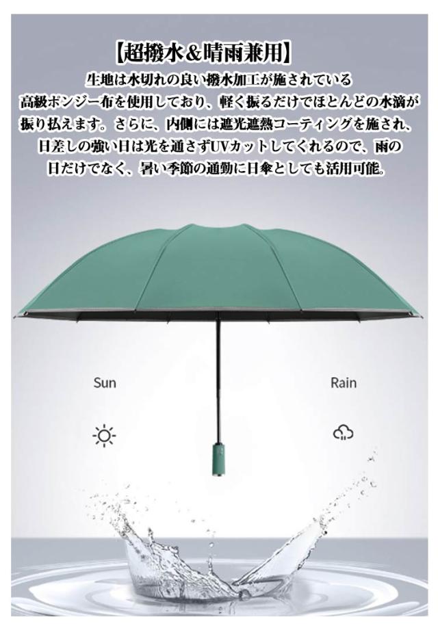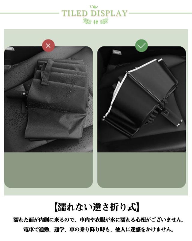 | 【自動開閉】 開閉はボタンを押すだけのワンタッチオープン・クローズ。ワンタッチタイプなので、荷物で手がふさがっていてもサッと自動開閉できます! 【濡れない逆さ折り式】 濡れた面が内側に来るので、車内や衣服が水に濡れる心配がございません。電車で通勤、通学、車の乗り降り時も、他人に迷惑をかけません。 【超撥水&晴雨兼用】 生地は水切れの良い撥水加工が施されている高級ポンジー布を使用しており、軽く振るだけでほとんどの水滴が振り払えます。さらに、内側には遮光遮熱コーティングを施され、日差しの強い日は光を通さずUVカットしてくれるので、雨の日だけでなく、暑い季節の通勤に日傘としても活用可能。 【コンパクトで携帯便利】 折りたたむ時の長さは32cm。カバンに入れて携帯できるスリムサイズで急な雨に降られても安心です。 【超大サイズの折りたたみ傘】 傘面の曲面長さが120cm、開く直径が107cm、雨を防げる範囲が大きくので、二人で荷物を持って傘に入っても余裕があるほどの大きさです。梅雨はもちろん、豪雨、強風にも安心できまる10本骨おりたたみ傘です。 【実用性抜群な傘】 持ち手が、大人っぽく上品な印象です! シックなカラーですのでお洋服と合わせやすいのもうれしいですね!男女老若を問わず、通勤、通学、旅行,出張などの場合がご利用できます。 | |