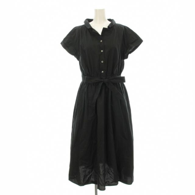 【中古】レイビームス オープンカラーシャツワンピース フレア ミモレ ロング 半袖 ハーフボタン ベルト付き 0 黒