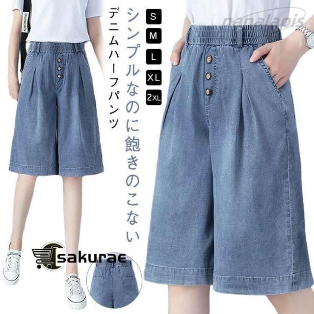 デニムハーフパンツ デニムパンツ レディース ハーフパンツ ハイウエスト ショートパンツ ウエストゴム 五分丈デニムパンツ 膝丈パンツ 短パン カジュ