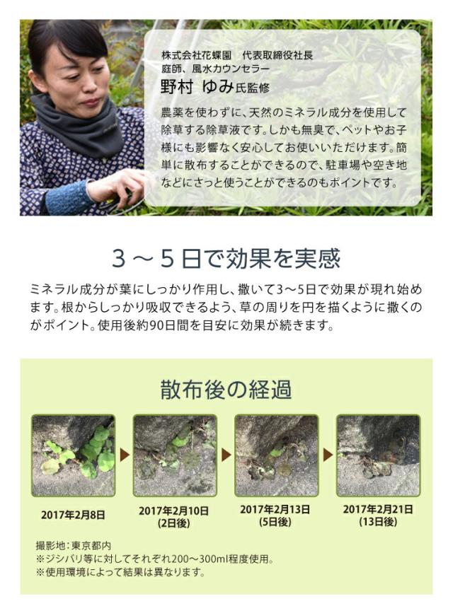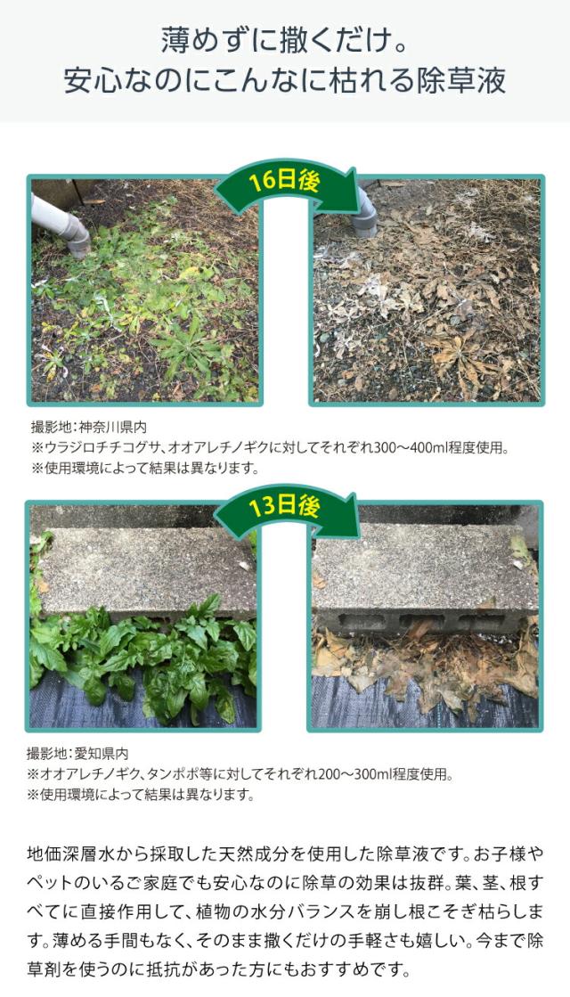 商品詳細: 庭師さんと共同開発!天然由来成分の人・ペット・環境に優しい除草液。薄めずに、そのまま枯らしたい草にかけるだけ。葉や茎、根までしっかり浸透し、3〜5日で効果が出始めます。