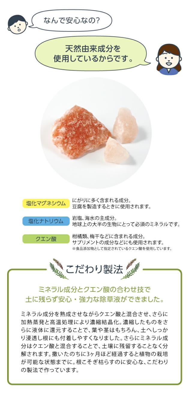 ※塩をまけば枯れるのではと思われそうですが、もし塩をまいてしまうと枯れる可能性がありますが、土壌での塩害の影響が心配されます。当商品はクエン酸との結合により土壌に残留することなく分解されます。