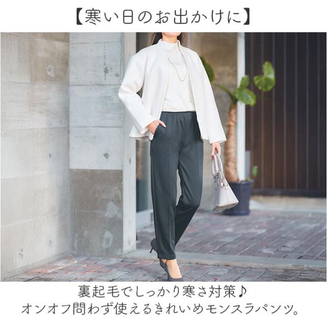 | 商品説明 | 【寒い日のお出かけに】 ・裏起毛でしっかり寒さ対策♪オンオフ問わず使えるきれいめモンスラパンツ。 【2つの股下の長さから選べる】 ・好きな股下の長さを選べる♪股下58cmと63cmの2タイプ展開。 【寒さ対策ができる裏起毛】 ・パンツの内側は裏起毛になっており、内側の温もりを逃がしにくく外側からの冷気からカバー。 【ストレスフリーに穿ける】 ・ウエストはゴム仕様で締め付け感がなく、いつでも快適に穿けるのも嬉しいポイント。 【オフィスカジュアルにも】 ・シンプルな見た目で普段使いはもちろん、オフィスカジュアルにも使える♪ 【便利なポケット付き】 ・スマホや名刺入れ、ミニウォレットが入るサイドポケット付き付き。 【幅広コーデに活躍☆】 ・トップスの色を選ばないベーシックカラー中心のラインナップ。幅広いコーデに対応。 |
