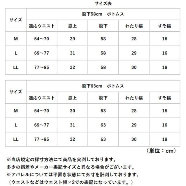 | サイズ | [レディース] ・M股下58cm ・L股下58cm ・LL股下58cm ・M股下63cm ・L股下63cm ・LL股下63cm ※サイズについて詳細は、商品画像の中にあるサイズ表をご覧くださいませ。 |