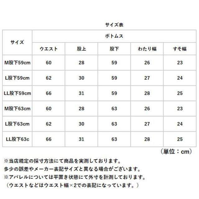 | サイズ | [レディース] ・M股下59cm ・L股下59cm ・LL股下59cm ・M股下63cm ・L股下63cm ・LL股下63cm ※サイズについて詳細は、商品画像の中にあるサイズ表をご覧くださいませ。 |