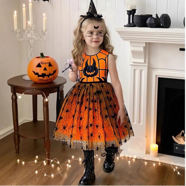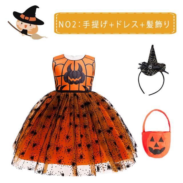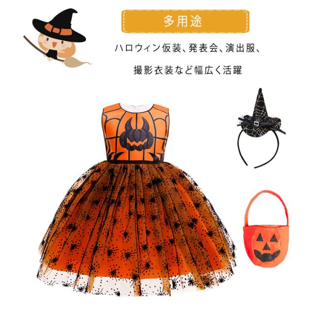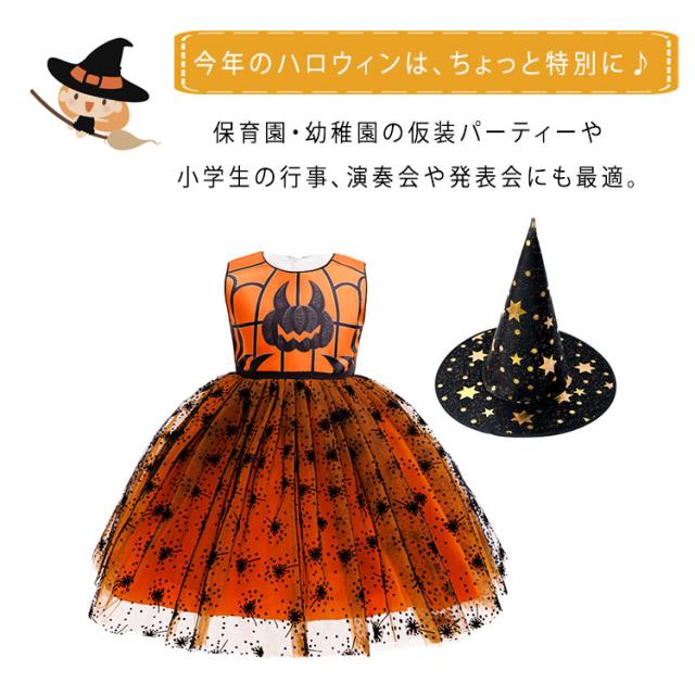 ハロウィン 衣装 魔女 子供 コスプレ 女の子 ワンピース 帽子付き ドレス ノースリーブ 小悪魔 吸血鬼風 可愛い ウィッチ プリンセス コスチューム セットアップ 【帽子+ドレス & 手提げ+ドレス+髪飾り】 選べる2タイプ オレンジ色