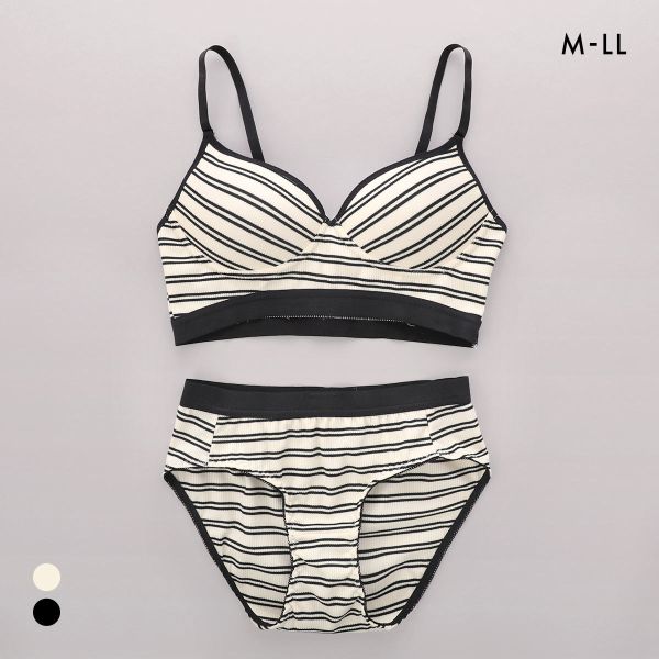細幅のリブボーダーにブラックの幅広アウトゴムを組みわせた、カジュアル&スポーティなノンワイヤーブラセット。ストレッチのきいた生地を全体に使用しているので、着心地抜群でしめつけ感が少なくストレスを軽減してくれます。